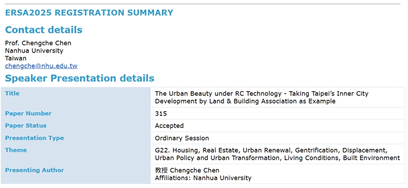 論文名稱The Urban Beauty under RC Technology - Taking Taipei’s Inner City Development by Land & Building Association as Example.