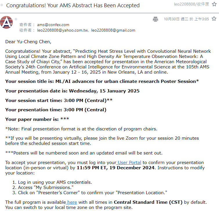 論文名稱Predicting Heat Stress Level with Convolutional Neural Network Using Local Climate Zone Pattern and High Density Air Temperature Observation Network: A Case Study of Chiayi City